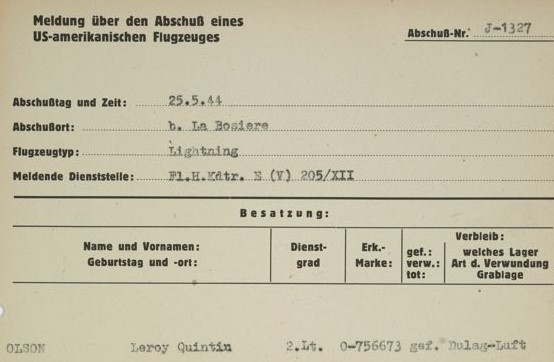 Rapport allemand du crash du P-38 du Lt Leroy Quintin OLSON