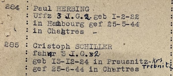 Malgré sa supériorité, la 3./JG enregistre deux pertes : - Le Fw-190 A-8 n° 730435 piloté par le Fhr. Christoph SCHILLER qui s'écrase à 9 km à l'Ouest de Rambouillet. Le pilote allemand est tué. - Le Fw-190 A-8 n°170378 piloté par l'Uffz Paul HERBING qui s'écrase à Villemeux-sur-Eure. Le pilote est tué. Les corps des deux pilotes allemands furent inhumés dans un 1er temps dans le cimetière Saint-Chéron de Chartres.