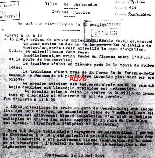suivit. Les archives de la défense passive de l'Eure-et-Loir relate une attaque identique à Courtalain le 25 Mai 1944 vers 10H40: "Mitraillage de train en gare de Courtalain; une locomotive est hors d'usage; un mécanicien (père de 7 enfants) est tué, un autre est grièvement blessé (amputation d'un pied et brûlures multiples et graves), un autre employé de la gare de Courtalain est blessé (transfert à l'hôpital de Châteaudun)". Cette attaque aérienne à Courtalain est très certainement celle du 385th FS.
