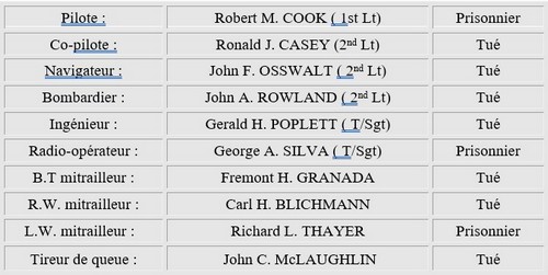 ![]() Photo du B-17 n°42-32082 prise par un autre appareil du groupe (source NARA) . Voici la composition de l'équipage en perdition: