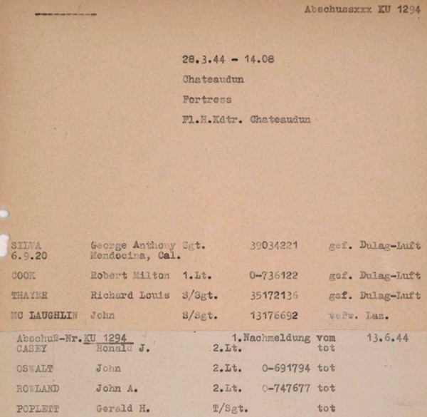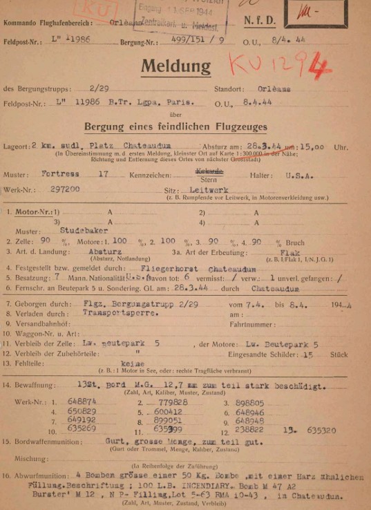 ![]() Sgt Melvin BAUGHMAN (Source : Famille BAUGHMAN, via Sam KONSAVAGE) . Les quatre survivants sont immédiatement capturés et faits prisonniers: le Sgt Morris ANDERSON, Sgt Dallas P. DALLAS, Sgt Conrad N. DESMARAIS et William H. ABBOT. Ils passeront le restant de la guerre dans le Stalag 17B près de Krems en Autriche. Le Sgt Conrad N. DESMARAIS décédera le 15 Octobre 2013 aux USA (cimétière Notre Dame à Fall River) ![]() Rapport de la Défense Passive de Châteaudn le 28 Mars 1944 ![]() ![]() EXTRAITS DU RAPPORT ALLEMAND (KU1294) ![]() ![]() ![]() ![]() ![]() ![]() Retour haut de page