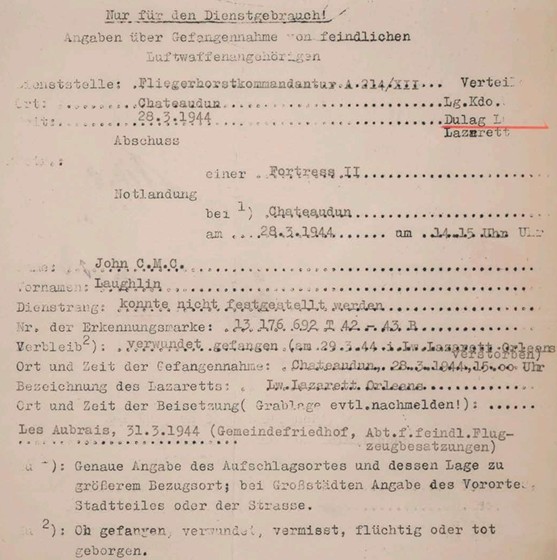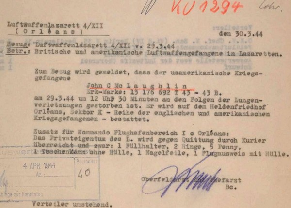 Rapport allemand confirmant le décès du S/Sgt Mc LAUGHLIN à Orléans