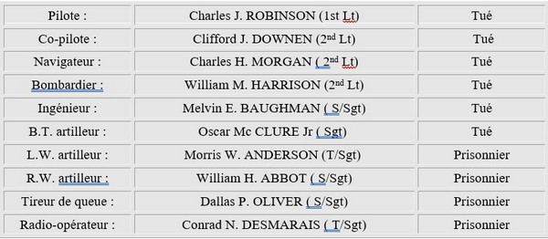 Le radio-opérateur Conrad N. DESMARAIS fut soufflé par l’explosion à l’extérieur de l’avion et il put ouvrir son parachute. Morris W. ANDERSON et OLIVER résistèrent à la chute de 12.000 pieds et restèrent dans la section de queue. Ils survécurent. Le Sergent ABBOT fut poussé à l’extérieur de l’avion par Morris W. ANDERSON.