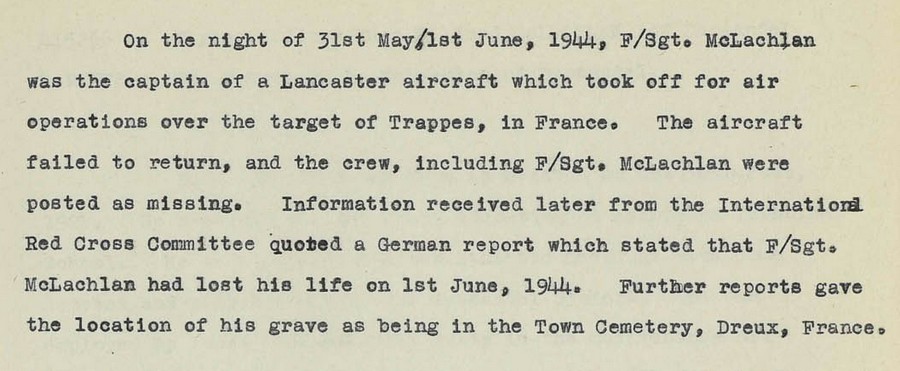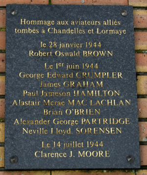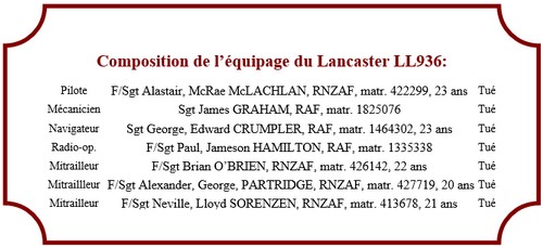 abattus. Le Lancaster de McLACHLAN fut également touché mortellement et l'appareil explosa immédiatement en plein air, ne laissant aucune chance aux aviateurs. Des civils français furent témoins de la catastrophe: Une boule de feu fut observée dans le ciel et l'appareil s'écrasa à Lormaye, à l'Est de Nogent-le-Roi. Une des deux ailes tomba sur le toit d'une des villageoise (pas de blessé civil). Les civils voulurent porter secours aux éventuels survivants mais les Allemands stationnés non loin de là (à Villiers-le-Morhier) arrivèrent immédiatement et empêchèrent les civils d'intervenir. En effet, les soldats nazis tirèrent en l'air à la mitraillette afin de les effrayer. Malgré tout, une vieille dame