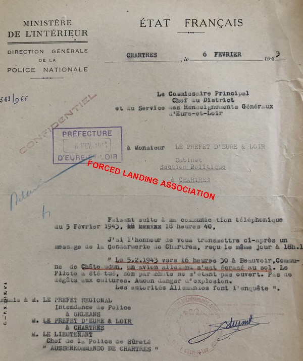 Le 05 Février 1943, à 16h30, le Ju-88 A-5 n°3402 (code tactique "F8+") de la 11./KG40 s'écrase au lieudit de Beauvoir, à Châteaudun. Le pilote, l'Ofw. Willi Oskar Ernst WALTHER, sauta en parachute mais il ne s'ouvrit pas. Les trois autres membres d'équipage moururent également : Fw. Hans STRELLER, l'Uffz Heinz SUDAU et l'Uffz Gerhard LUENS.
