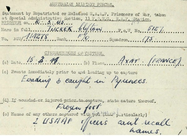 sourd et muet car il ne parlait pas assez bien le français. L’évasion du Lt TUCKER fut ensuite semée d’embuches et le pilote jouera de malchances. Tout d’abord, il fut transféré vers Paris, dans l’appartement d’une femme dentiste dont le mari avait été tué par les Allemands. Un Lysander aurait dû le ramener en Angleterre mais, au dernier moment, on lui interdit de monter dans l’appareil, sans plus d’explications. En compagnie de quatre autres aviateurs, il fut emmené à Nice par le train, où il fut pris en charge par une baronne. Elle leur expliqua qu’ils pouvaient franchir la frontière espagnole et de là, rejoindre Barcelone où se trouvait la British Navy qui pourrait ensuite les conduire en Angleterre. Le passeur n’étant pas au rendez-vous convenu, lui et deux autres officiers américains décidèrent de traverser par eux-même les Pyrénées mais, mal chaussés, ils durent rebrousser chemin et ils furent dénoncer à la Gestapo par un prêtre et furent faits prisonniers le 15 Mars 1944 sur la Commune d'Axat (Aude) .Clifton TUCKER eu des gelures au pied droit qui l’handicapèrent tout le restant de sa vie.