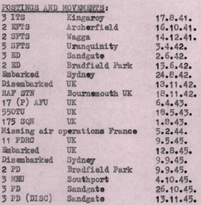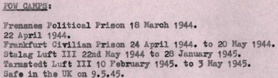 SA CAPTIVITE Le 18 Mars 1944, avec ses camarades d'infortune, il fut incarcéré à la prison de Fresnes, près de Paris, dans des cachots individuels durant un mois (avec tortures) jusqu'au 22 Avril 1944. Il fut ensuite transféré en Allemagne, dans une prison civile de Francfort du 24 Avril au 20 Mai 1944 puis il fut transporté au Stalag Luft III du 22 Mai au 28 Janvier 1945, puis au Tarmstedt Luft III du 10 Février au 3 Mai 1945, date à laquelle il fut libéré à Lübeck par les Américains (avec 37 autres compatriotes australiens). Il retourna en Angleterre le 9 mai 1945 et il passa deux mois dans l’hôpital de Bournemouth. Il embarqua finalement sur le navire Orion et arriva à Sidney, via le canal de Panama, en Septembre 1945. Il décèdera le 16 décembre 1988, à
