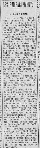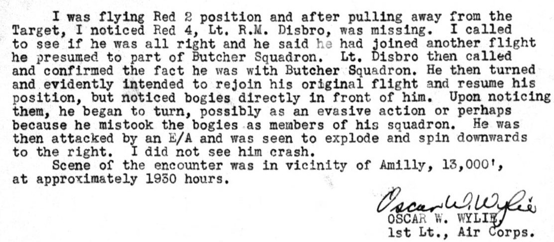 - Le P-47 n° 42-75222 du 373rd FG, 410th FS piloté par le 2nd Robert M. DISBRO (matr. 0-821309) est déclaré perdu vers Amilly (dernier lieu où il fut aperçu). L’appareil explosa en plein vol et le pilote est déclaré « disparu » et réputé "tué". L lieu du crash demeure indéterminé.