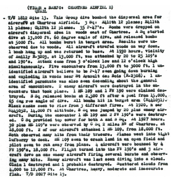 Heure indéterminée: Ce 07 Août, les Spitfire du 350 Squadron (Belge) réalisent une mission de reconnaissance jusqu'à Chartres. Les B-26 du 391st Bombardent un pont ferroviaire à Nogent-le-Roi.
