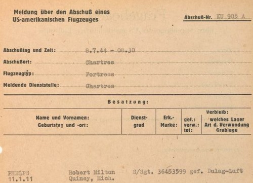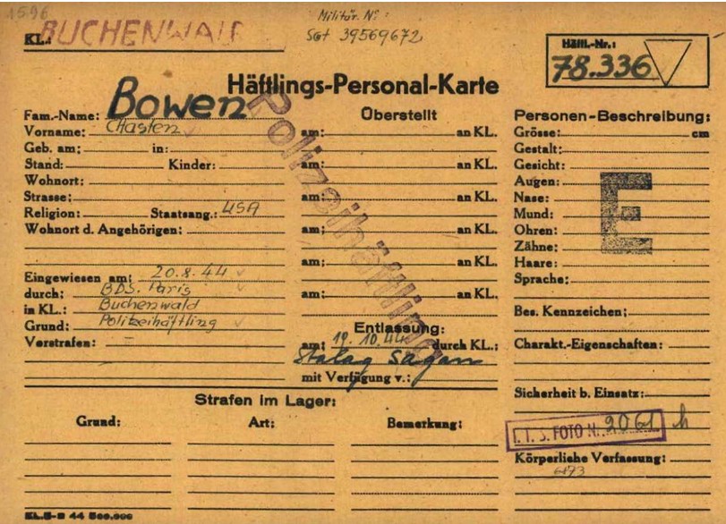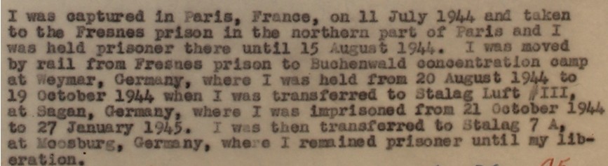 excepté qu'il ait été capturé par les Allemands. Il fut interné à la prison de Fresnes avant d'être envoyé le 15 Août 1944 en Allemagne avec un convoi de 168 aviateurs alliés dans le camp de Buchenwald où il arrivera le 20 Août suivant. Il portera le n° de prisonnier 78.349.