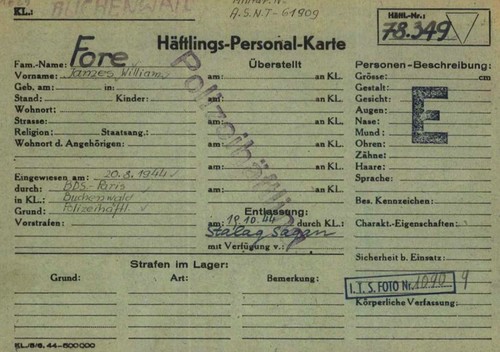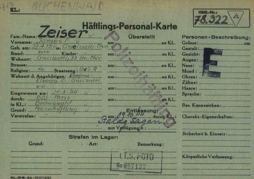 Fiche d'internement du Sgt ZEISER dans le camp de Buchenwald