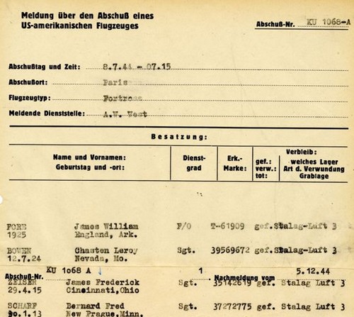 occasionnée lors du saut. Il le ramèna à son domicile où il restera caché pendant trois jours. Le 11 Juillet 1944, il partira ensuite avec avec 2 autres aviateurs (vraisemblablement FORE et SCHARF) pour une destination inconnue. Son sort sera identique à ses camarades FORE, BOWEN et SCHARF. Remis àau faux résistant et agent double Désoubri, il sera livré à la Gestapo et capturé avec des habits de civils et donc considérés comme un espion ennemi, le privant ainsi de ses droits de "prisonnier de guerre".