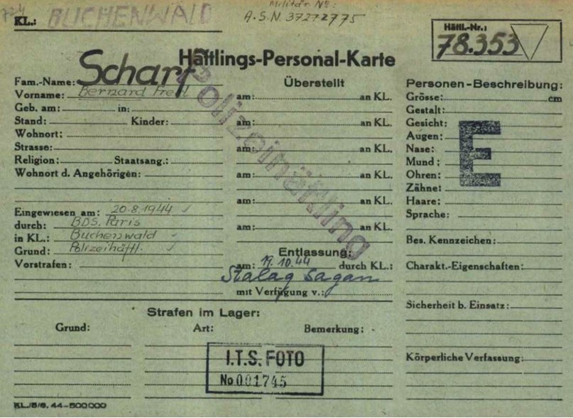 Fiche d'internement du Sgt SCHARF à Buchenwald
