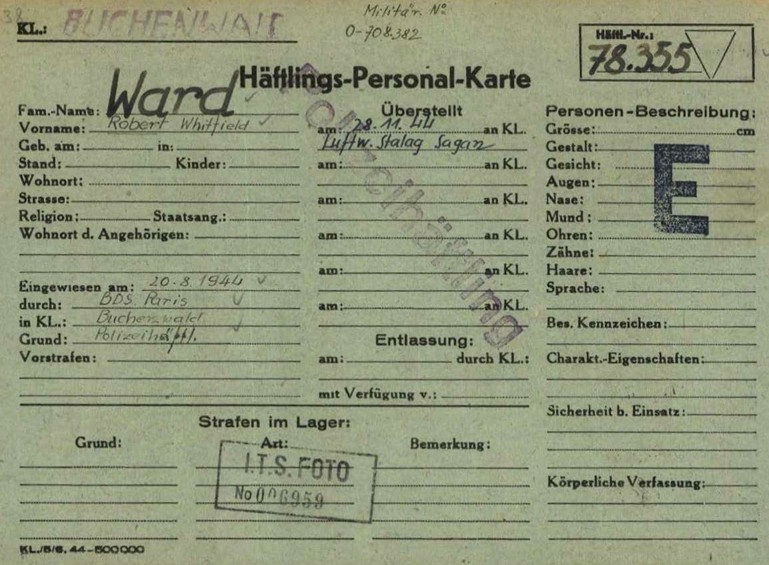 Fiche d'internement du F/O James William à Buchenwald (Source: The Buchenwald Airmen) La présence de prisonniers de guerre dans le camp de concentration de Buchenwald étant contraire aux Conventions de La Haye et de Genève, les 168 aviateurs seront transférés vers des camps dédiés et le F/O James FORES fut ensuite transféré au Stalag Luft III le 19 octobre 1944.