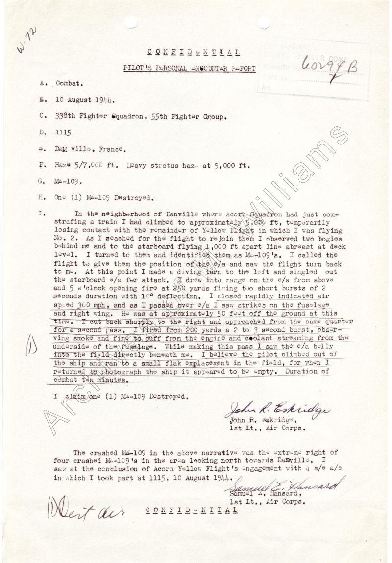 Me-109 détruit. - Le Lt John R. ESKRDIGE, en