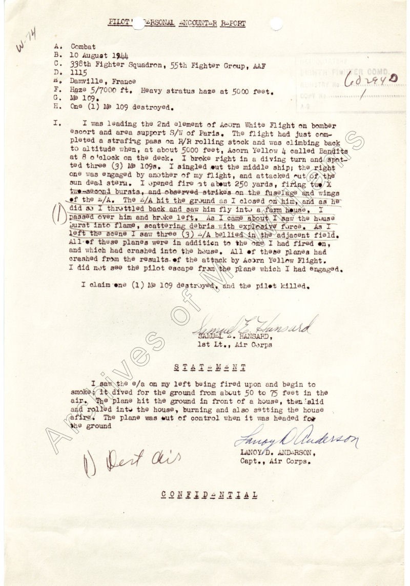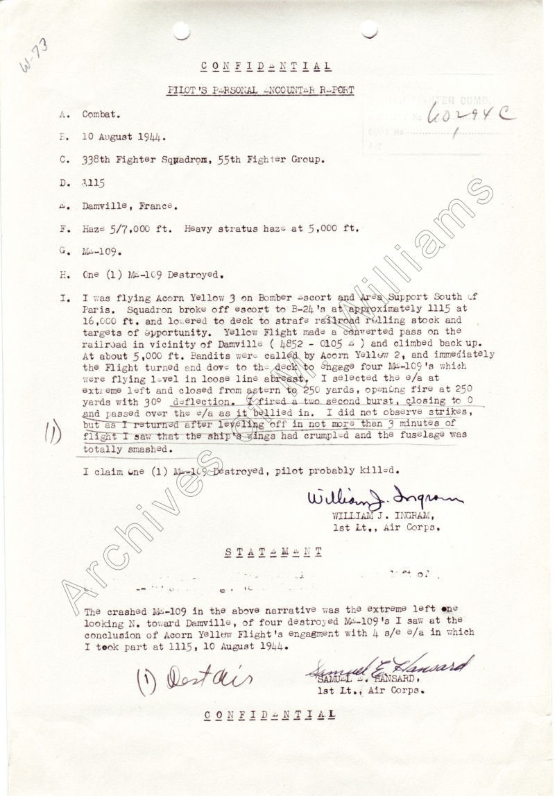 Témoignage d'un civil français (M. Seigneuret du Plessis): "Le P-38 est tombé au lieu-dit "Le Plessis" à Marboué le 10 août 1944. Il était un peu avant midi, nous habitions le hameau du "Tronchet". On entendit une mitraillade du côté de Marboué, je levai la tête et vit apparaître un avion "deux queues" en train de planer et soudain penche à gauche et piquer au sol. Une explosion, une grosse boule de fumée apparait au-dessus du bois. Quand les explosions et le feu se calmèrent, les gens du village de Plessis s'approchèrent et, parmi les débris éparpillés et fumants, ils avisent un morceau plus gros que les autres et le retourne: c'était le pilote, il n'avait plus de jambes. Comme il reposait à plat ventre, ses papiers d'identité dans la poche de son blouson ne sont pas brûlés et il pouvait être identifié. Les villageois lui firent un petit cercueil et l'enterrèrent au bord de la mare où il sera récupéré par les Américains, dès notre libération le 17 Août 1944".