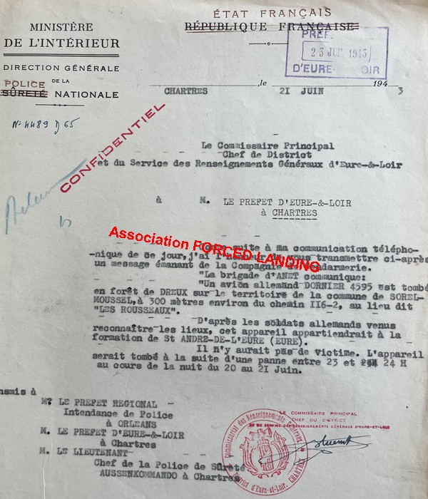 Inhumation des corps au cimetière Saint-Chéron de Chartres (Archives de la Ville de Chartres) . . Dans la nuit suivante du 20 au 21 Juin 1943, un second appareil, cette fois-ci un Do-217 réalise un atterrisage forcé au lieudit "les Rousseaux" à Sorel-Moussel. Il s'agit du Do-217 N-1 n°4595 (Code tactique "U5+") du III./KG2. L'ensemble de l'équipage survit, sans même une blessure. L'appareil est endommagé à 85%.