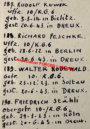 Le 20 Juin 1943, le Ju-88 A-14 n°4169 (Code tactique "3E+") du 10./KG6 s'écrase sur le terrain d'aviation de Dreux durant un vol d'entrainement. Les quatre aviateurs trouvèrent la mort dans le crash de leur appareil. L'équipage est composé de: - Uffz PESCHKE Richard (20 ans) né le 28/06/1922 à Berlin (Bloc2, Rang14, Tombe 682). Ce dernier était le pilote de l'appareil. - Uffz KUWIK Rudolf (29 ans) né le 03/03/1914 à Bielitz (Bloc2, Rang15, Tombe 726) - Gfr.RODEWALD Walter (19 ans) né le 23/12/1923 à Soltau (Bloc2, Rang, Tombe 583) - Obergefreiter STÄHLI Friedrich (20 ans) né le 29/03/1923 à Köln-Dellbrück (Bloc2, Rang14, Tombe 700). . Dans un 1er temps, leurs corps furent inhumés dans le cimetière Saint-Chéron de Chartres (Tombes n°187 à 190) , puis dans le cimetière militaire allemand de Solers (77) après la guerre où ils reposent aujourd'hui encore.