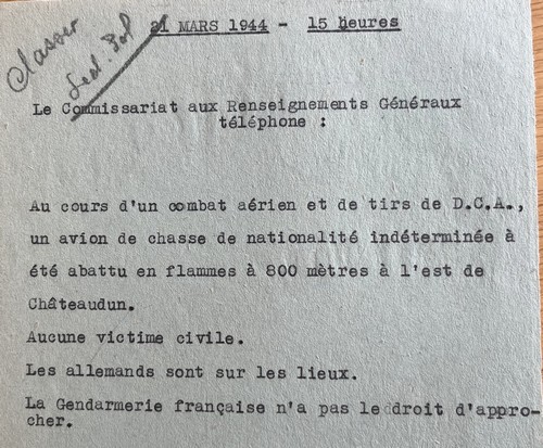 Dans un premier temps, l'appareil ne fut pas identifié et la Gendarmerie français n'eut pas le droit d'approcher des lieux du crash. Son corps sera ensuite inhumé temporairement dans le cimetière de Châteaudun.