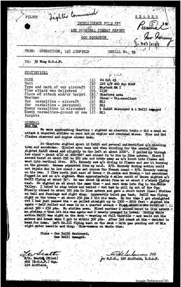 Le 24 Octobre 1943, deux Mustang I du 400 Squadron (RCAF) sont en mission de type RHUBARB dans la région Rouen-Chartres. Le rapport du F/O L. W. SEATH précise que, vers 11H30, en arrivant près de Chartres, lui et son ailier (le F/O KENNEDY) prirent en chasse un train électrique et des impacts étant observés sur les voitures, la locomotive et sur les caténaires. Peu après, ils observèrent 12 Hs-126 et de nombreux autres appareils non identifiés tournant autour de la ville de Chartres. Le SEATH et le FLO KENNEDY firent un premier cercle autour de la ville puis prirent pour cible un Hs-126 situé devant, à une altitude de 1.000 pieds. Les Mustangs approchèrent en se cachant dans une couche de nuages bas, puis le F/O SEATH fonça sur le Hs-126, tira sur lui durant trois secondes à une distances de 250 à 100 yards. Le Hs-126 explosa en flammes immédiatement et plongea vers le sol et le F/O SEATH abandonna le combat. Le F/O KENNEDY vit un appareil plonger en flammes et exploser au sol, confirmant ainsi cette victoire.