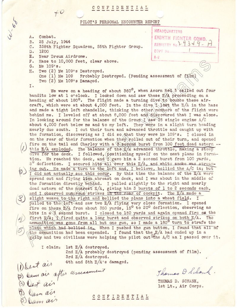 endommagés. Le Lt Thomas D. SCHANK déclara deux Me-109 détruit,
