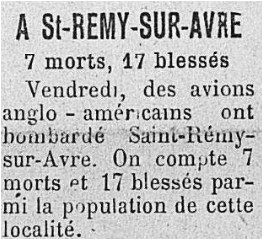 occupants. L'appareil est détruit. . 09H15-09H50: Bombardement à Dreux/Saulnière/Morvillette par des vagues de chasseurs et bombardiers. L'objectif étaient les voies ferrées et les routes. Tirs intenses de la DCA. . . JOURNEE DU 28 JUILLET 1944 . 07H50-08H00: Bombardement de la voie ferrée entre la gare de St-Sauveur/Theuvy-Achères/Clévilliers par 8 chasseurs-bombardiers. 8 bombes. . 08H15: Bombardement de la voie ferrée et du viaduc sur l'Aunay, près de la gare d'Auneau par 8 chasseurs-bombardiers. Les voies sont endommagées. 6 bombes de 250 Kg. . 08H30: Mitraillage d'un camion près du bourg d'Auneau. . 09H00: Mitraillage d'une voiture du Commissariat au Sport à Toury. . 09H45: Mitraillage d'une camionnette de la SNCF à Mignières sur la RN10. . 15H15-15H20: Deux vagues de bombardiers ciblent le viaduc de St-Rémy-Sur-Avre . 50 bombes sont larguées et touchent également le coeur de ville dont l'église, la Grande-Rue, la Rue de la Justice et la Rue de la Gare. On dénombre 9 civils tués et 30 blessés.