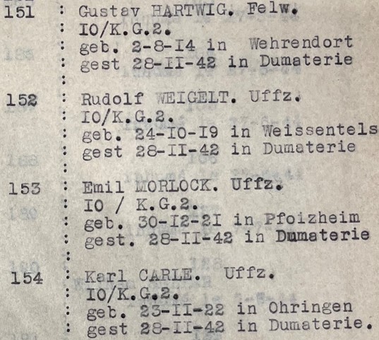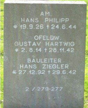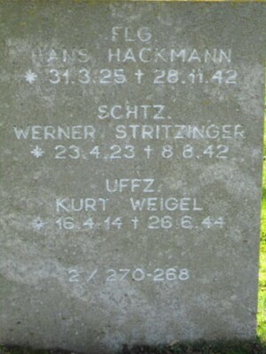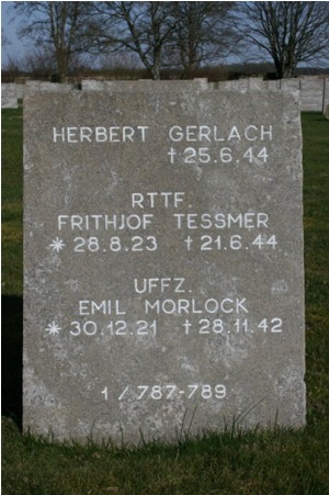 L'ensemble de l'équipage périt et les corps sont inhumés au cimetière Saint-Chéron de Chartres (tombes n°151 à 154) dans un premier temps puis au cimetière militaire allemand de Solers (77) après la guerre: - Fw Gustav HARTWIG (28 ans, né le 02/08/1914 à Wehrendorf) était le pilote. Son corps repose désormais au cimetière militaire allemand de Solers (Bloc 2, Rang 6, Tombe 278). - Uffz. Karl CARLE (20 ans, né le 23/11/1922 à Öhringen). Son corps repose au cimetière militaire allemand de Solers (Bloc1, Rnag19, Tombe 786. - Hans HACKMANN ( 17 ans, né le 31/03/1925 à Osnabrück). Son corps repose désormais au cimetière militaire allemand de Solers (Bloc, Rang, Tombe). - Uffz. Emil MORLOCK (20 ans, né le 30/12/1921 à Pforzheim). Son corps repose désormais au cimetière militaire allemand de Solers (Bloc 1, Rang 19, Tombe 789). - Uffz. Rudolf WEIGELT (23 ans, né le 24/10/1919 à Weissenfels). Son corps repose désormais au cimetière militaire allemand de Solers (Bloc 1, Rang 16A, Tombe 680).