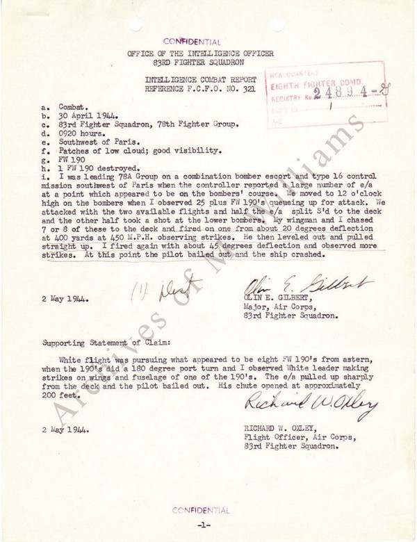 Rapport de victoire du Major Olin E. GILBERT le 30 avril 1944 (source: Site WWII Aircraft Performance)