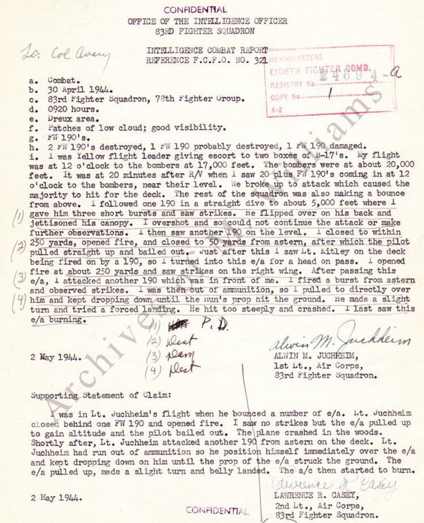 . Rapport de victoire du Cpt Alwin Max JUCHMEIM le 30 avril 1944 (source: Site WWII Aircraft Performance)