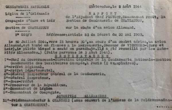 Rapport de la gendarmerie du 3 Août 1944 . - De la même façon, le Me-109 ("1 noir") du Lt Hans HALBEY de la 9./JG1 qui effectuait sa 1ère sortie sur le front de Normandie est touché et saute en parachute dans la même région de la Ferté-Bernard. Sérieusement blessé, il sera hospitalisé à Chartres. - Sans doute à l'occasion du même accrochage avec des Spitfire, le Me-109 n°165805 de l'Uffz. Anton KRONBERG du 1./JG5 est abbatu à la même heure vers Dreux et son pilote est sérieusement blessé. Pour sa part, le Ofhr. HECKMANN de la 9./JG1 touche un des chasseurs britanniques au Nord-Est de la Ferté-Bernard.