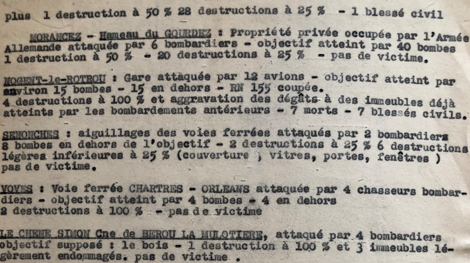 12H45: Bombardement du quartier de la gare de Nogent-le-Rotrou par deux escadrilles de 8 avions venus d'Est vers l'Ouest à basse altitude. 7 morts et 7 blessés. Bombes de 1.000 Kg de type américain (1 mètre de longueur, 65 cm de diamètres et de couleur grise).