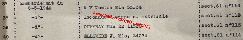 Mortellement touché par un chasseur de nuit allemand, vers 23H30, il s'écrase au lieudit "Malaffie" à Aunay-sous-Auneau / Allainville. Les restes de 6 hommes d'équipage furent retrouvés carbonisés dans la carcasse de l'appareil et le corps du F/O Albert J. NEWTON fut retrouvé (et identifié) près de l'aile du Lancaster. Les soldats allemands vinrent avec 7 cercueils mais ils n'en utilisèrent que quatre, qu'ils emmenèrent ensuite en camion à Chartres. Les corps furent inhumés au cimetière de Chartres (tombes n°110, 113, 114 et 116, Field 61) puis au cimetière militaire de Saint-Désir-de-Lisieux après la guerre.
