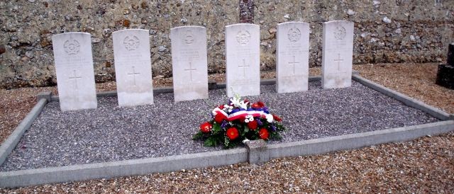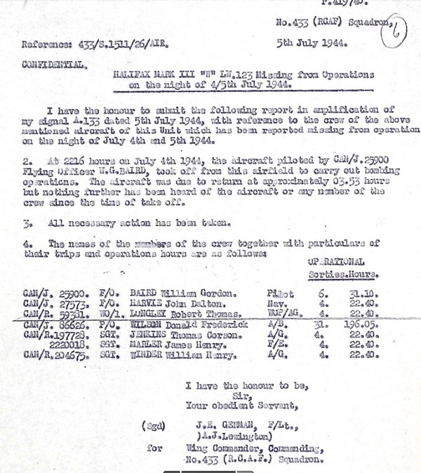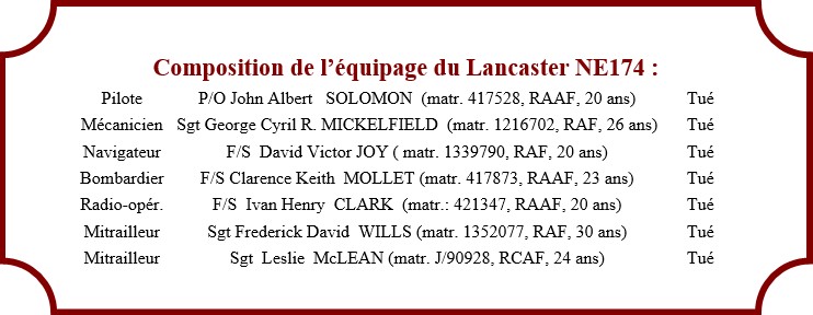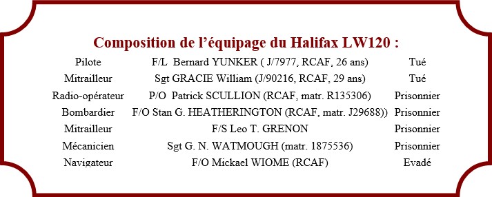 entama sa chute. Le Halifax s’écrasa finalement sur la Commune de Laons, 1km au Sud du lieudit « Thessily », avec cinq hommes à son bord. L’opérateur-radio eut le temps de sauter en parachute mais l’altitude fut insuffisante pour permettre au parachute de se déployer. Il sera retrouvé mort par un habitant de Blévy. Seul le navigateur canadien, John HARVIE put attraper son parachute et sauta alors que l’apparteil n’était plus qu’à 3.000 pieds d’altitude.