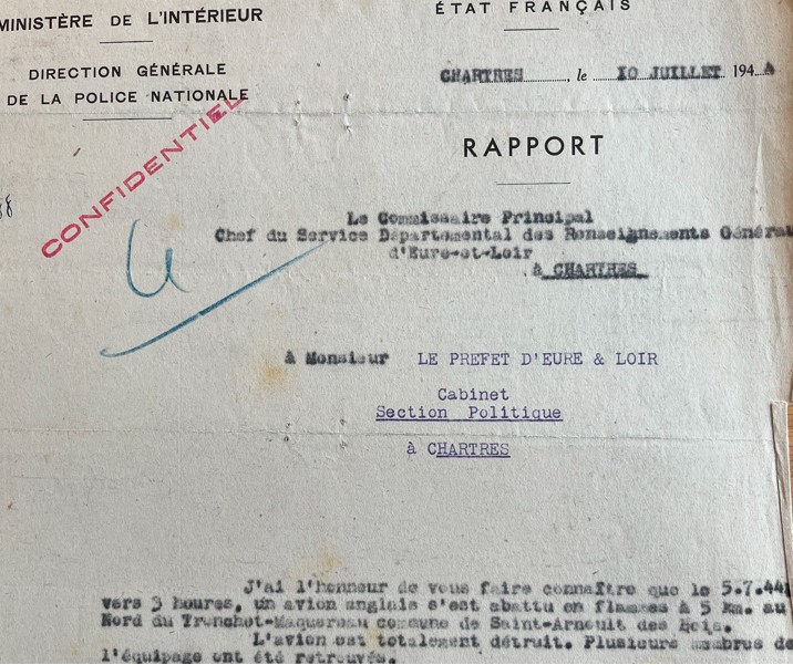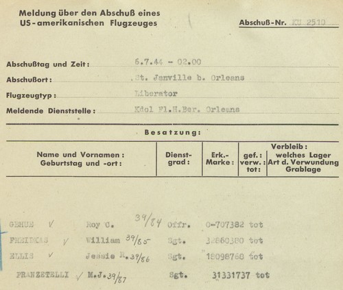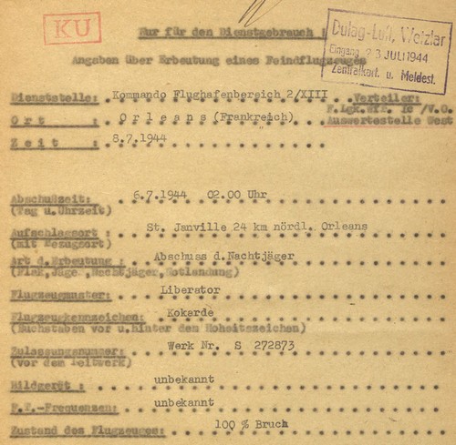 Rapport allemand - Crash de Trancrainville (source: catalog.archives.gov) . Trois corps brûlés furent retrouvés dans l'épave, deux à