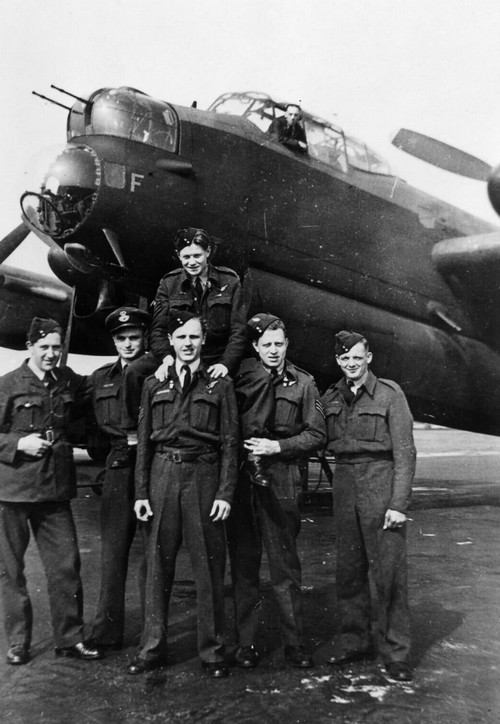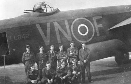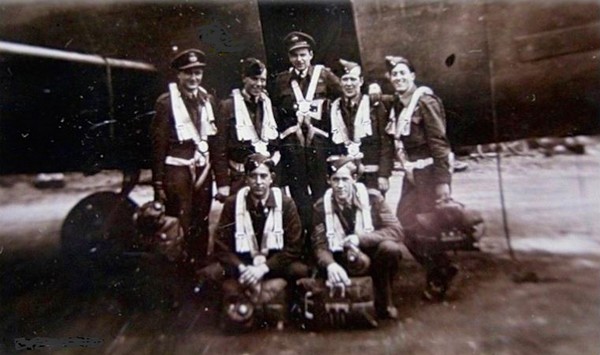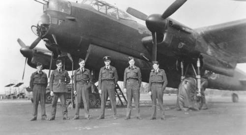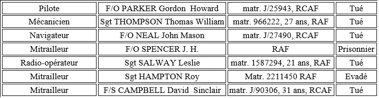 Debout de gauche à droite: F/O John M. NEAL, F/S James H. SPENCER, F/O Gordon H. PARKER, inconnu, inconnu. Devant de gauche à droite: F/S David S. CAMPBELL, Sgt Leslie SALWAY.